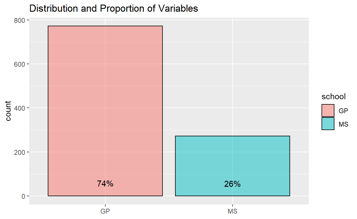 The code chunk here using ggplot will plot a bar chart to visualize the distribution and proportions of variables. The proportion percentage of each input will be calculated and reflected on the chart itself for the user to readily have exact data on the proportions. This was made more obvious by adding transparency to the bar chart.