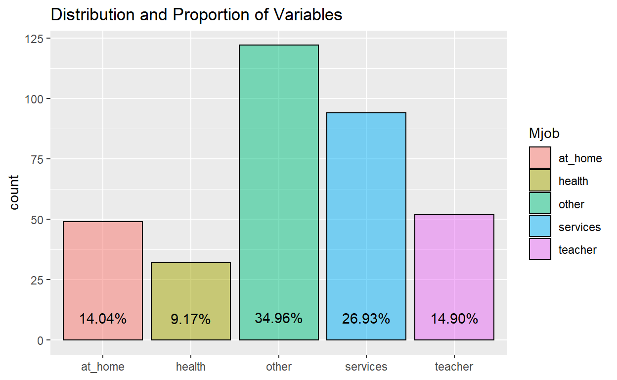 geom_bar(aes(x = Mjob, fill = Mjob), color = "black", alpha = 0.5) +