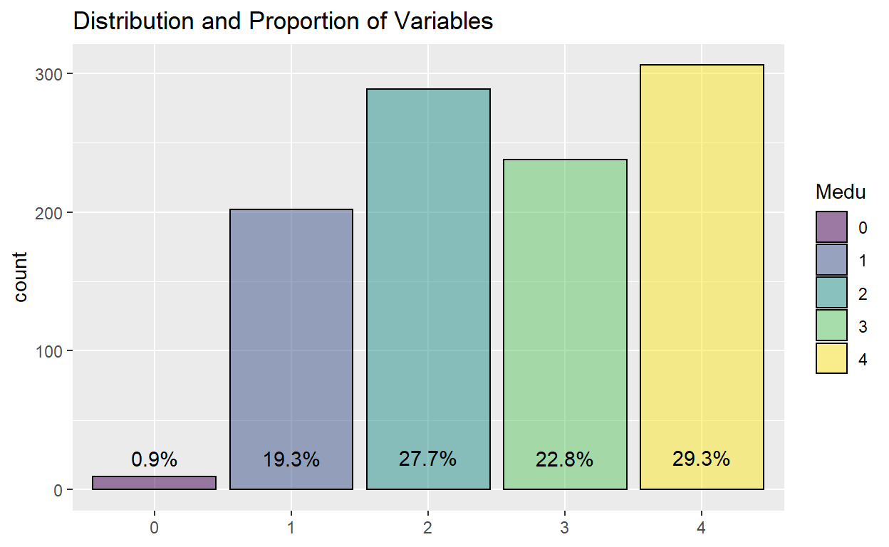 geom_bar(aes(x = Medu, fill = Medu), color = "black", alpha = 0.5) +