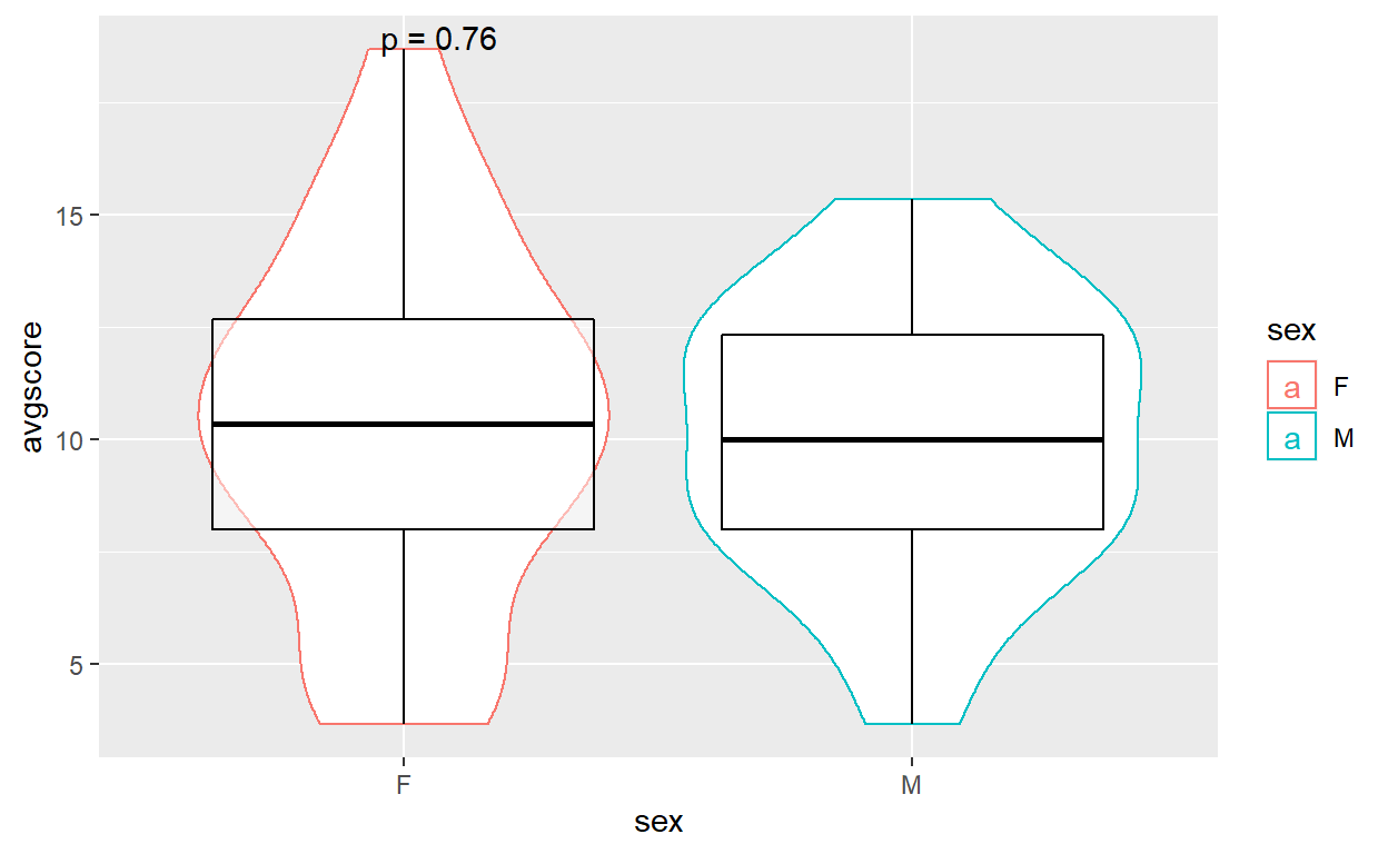 p <- ggplot(data_MS_math, aes(x = sex, y = avgscore, color=sex)) +