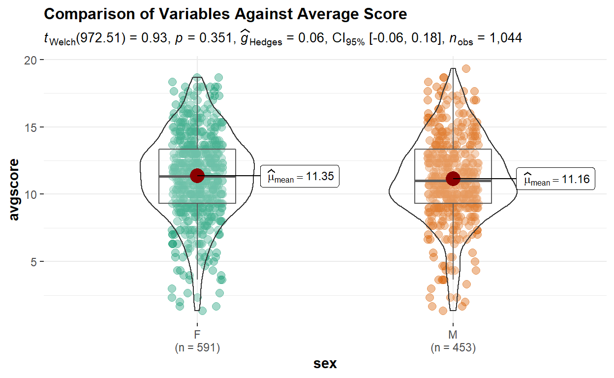 However, testing out the plot generated by ggbetweenstats was found to be a better option due to several reasons. Aesthetically it provides a chart with better design, as well as automatically providing more information such as number of variable input size and the mean for each input. It also is able to produce a violin and boxplot to visualize the interquartile range and distribution of data points.